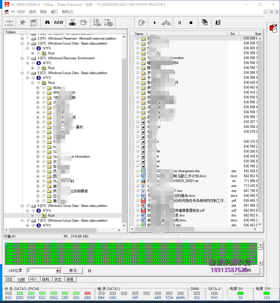 工程师接到硬盘后检测判断为磁头损坏导致硬盘敲盘异响,工程师在配件库中找到同型号配件盘进行开盘更换磁头.磁头更换成功后通电测试正常,启动PC3000进入Western Digital的WDC Marvell进行固件读取完成,使用Data Extractor建立磁头位图,分头进行测试磁头和盘片的性能,由于客户数据量小经过1个多小时的恢复过程完整的恢复出客户指定的全部重要数据.