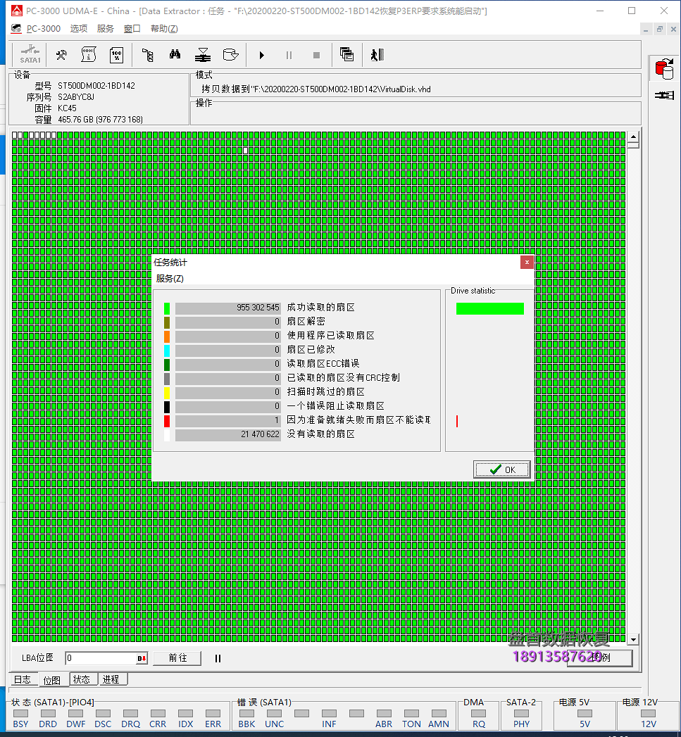 工程师接到硬盘后检测硬盘通电敲11声后停转,,由于客户要求原来的操作系统也要一起启动起来才可以正常使用,因为这个ERP软件服务商可能已经无法找到了也无法从新安装,,因为这样的数据恢复要求的对于我们来说恢复难度还算是比较大的!因为这种硬盘磁头损坏更换磁头后很难保证没有坏道,或者其它不确定因素.