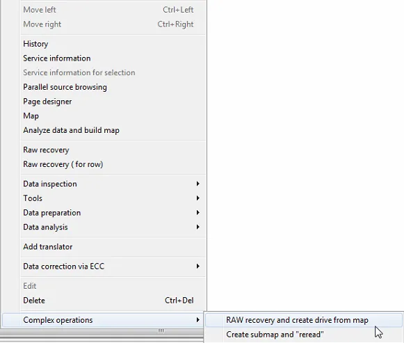 步骤5.我们需要从最后一张图的“复杂操作”菜单中启动“ RAW恢复并从MAP创建虚拟驱动器”选项。 PC-30000 Flash版本提供此一键单击选项。 7.4.17及更高版本。