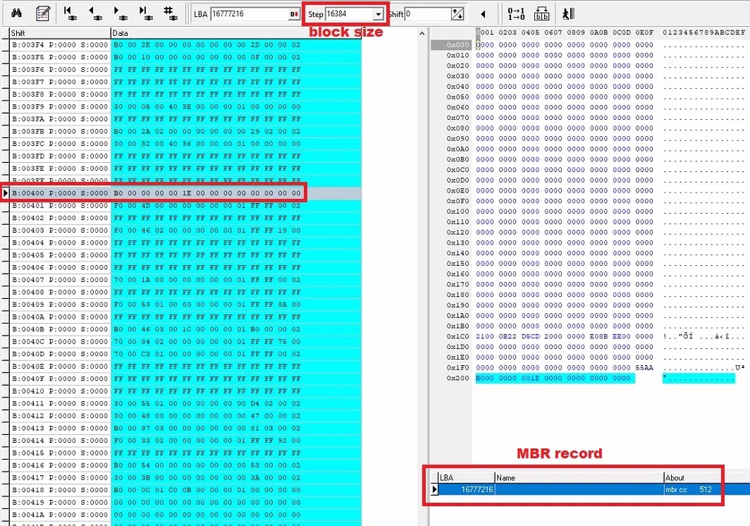 首先,我们需要在RAW扫描中找到MBR记录,并将其添加到“搜索结果”中。 它使我们能够找到逻辑块#0(有关更多信息,请参见本文)。