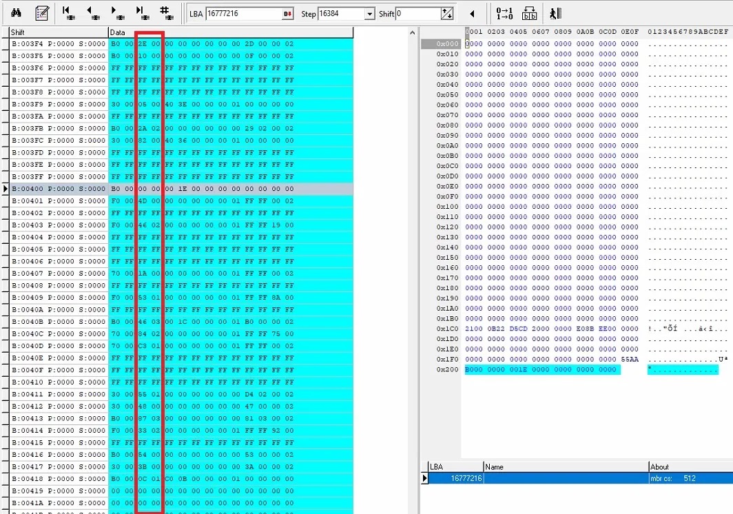 现在,我们使用“块号”方法来确定“图像”构建过程的标记位置。 MBR记录在SA中几乎总是带有00 00标记。 如果我们查看服务区中的所有块,我们可以跟踪它们的变化情况。