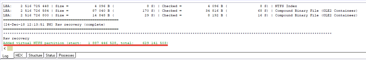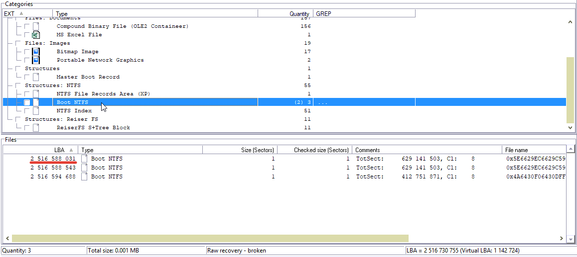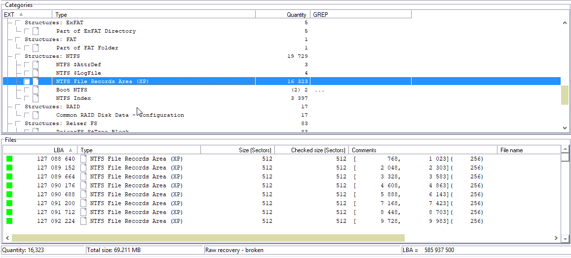 从RAID阵列恢复数据的RAW恢复和统计数据。 我们对125,000,000个扇区之后的所有成员启动RAW恢复,并检查结果。