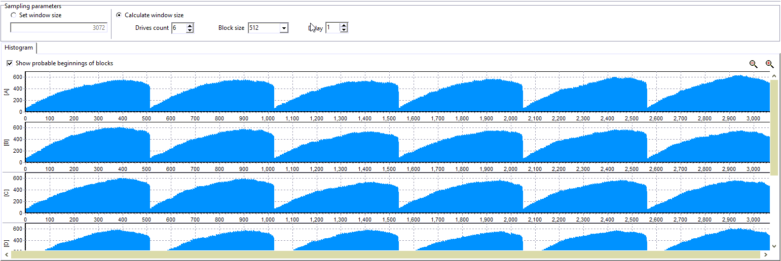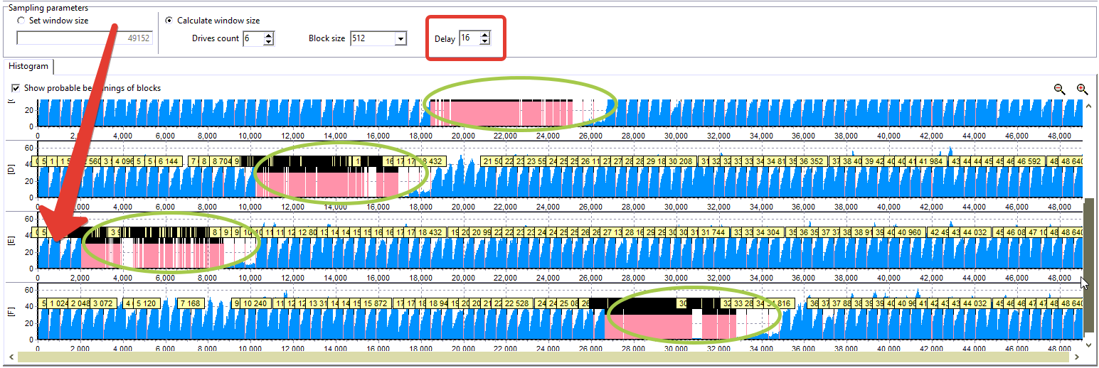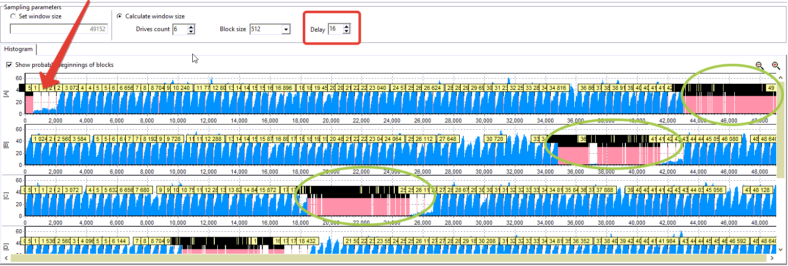 该图表说明了前4个磁盘的XOR区域。 此外,它表明,从〜2000个扇区开始,会有一些变化。