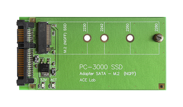 | SATA-M.2适配器旨在将基于M.2 key B或 key(B + M)接口的SSD连接到PC-3000系统的端口。 这种类型的SSD使用以M.2外形尺寸的小型版本实现的SATA传输接口。 该适配器配有3.3V电源LED和驱动器活动LED指示灯。 支持以下尺寸的单面和双面PCB(D1至D5):Type 2230, Type 2242, Type 2260, Type 2280 |