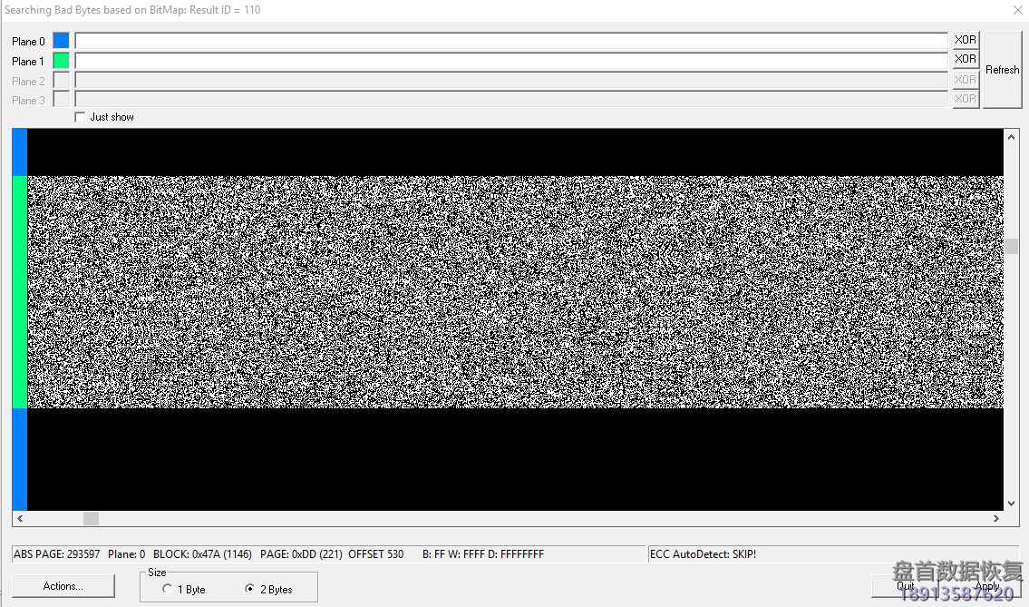 如您所见,PLANE 0上的所有块都是黑色的。 这意味着只有一半的闪存驱动器充满了数据。 这也意味着我们只需删除PLANE 1上的插入内容。 通常,我们建议在所有平面中滚动转储和搜索插入。 但是,在这种情况下,只有PLANE 1包含整个转储中的数据。