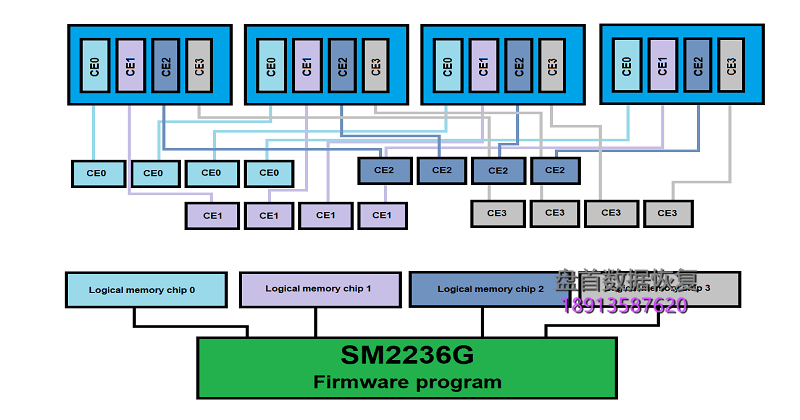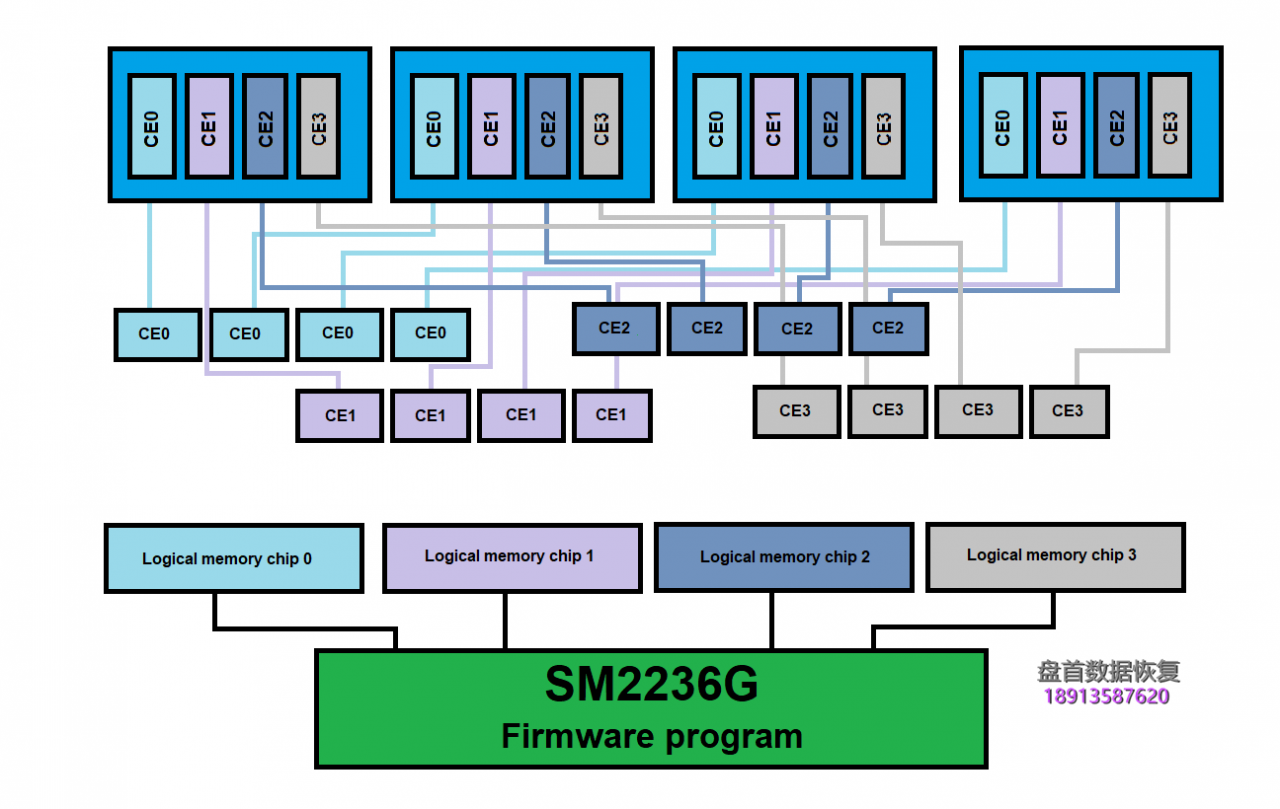SM2236G固件程序将所有这些部件视为4个逻辑芯片阵列,所有带有块和页面的写入操作都将使用此虚拟逻辑存储器芯片执行。同时,控制器将按QWords(每个部分8个字节)分割所有数据,并将数据放在每个CE部分中。