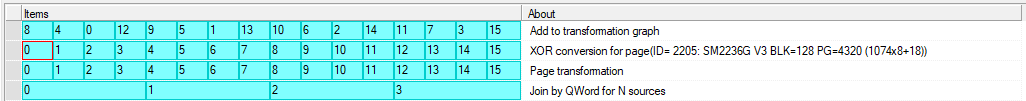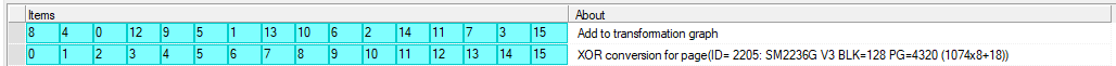 在SM2236G控制器中有一种检测存储器芯片顺序的方法。如果检查服务信息工具中每个部分的第一个块中的第一个字节:0,4,8,12,您将看到部分字节:SM2236PA,RA / -idx,芯片ID,Tm。