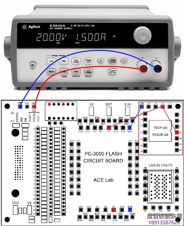 切换器可以设置为单块读取程序(通过PC-3000 Flash读取器或不带电源控制)。 请注意,对于TSOP存储器芯片需要手动焊接电源线! 对图像上的焊线很重要!