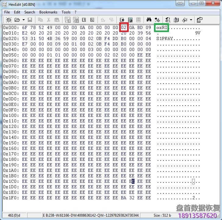 这些奇怪的情况有简单的解决办法。很多来自box的RAID阵列具有RAID 0配置,块大小为1扇区。此外,它们在上一领域也有具体的特点。上一个扇区中的元数据从oxRI签名开始,在0x00 – 0x03偏移量(在屏幕快照上用绿色矩形标记)。