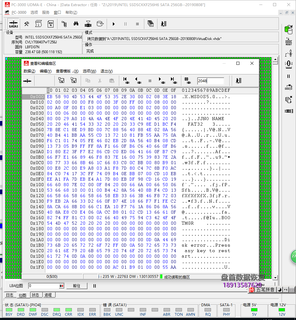 北京客户寄修一块英特尔m.2 NGFF接口固态硬盘型号SSDSCKKF256H6主控SMI(SM2258G)客户描述笔记本装了一个外接设备的驱动不兼容,Windows 10系统蓝屏报错,重新启动就一直卡死在开机品牌画面无法读取SSD硬盘。客户通过搜索到本公司进行数据恢复。工程师收到硬盘后检测SSD硬盘故障为(通电就绪,操作就忙)。工程师通过技术手段进行修复后成功识别到硬盘型号。使用PC3000 DE提取数据并完整镜像磁盘,客户通过QQ远程确认数据非常满意,要求我们百度云盘传回数据。