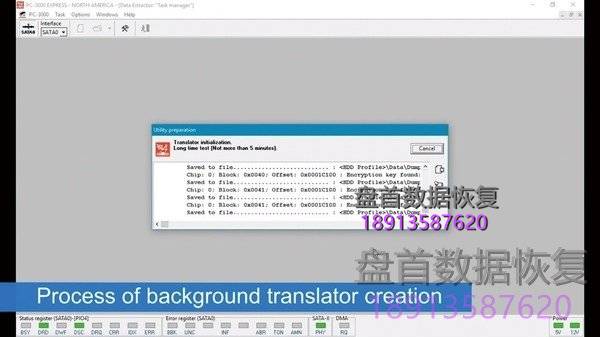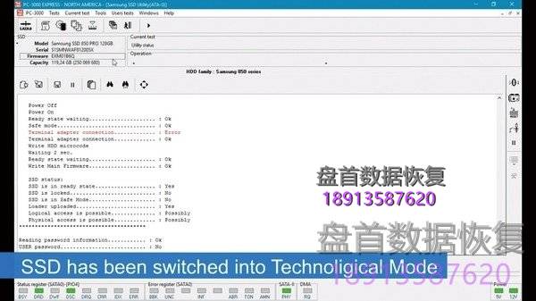 首先连接PC-3000,进入程序。程序中可见无ID显示,无法通过初始化,固态盘无法正常工作。接下来加载经修改的固件,接入终端适配器以便加载LDR;依提示接入适配器,加载后出现ID信息,接着切换至技术模式;最后处理映射表操作,在DE(Data Extractor,是与PC-3000产品配套使用的一款软件产品,拥有DE功能后用户可以从硬盘上恢复数据、提取电子证据)中可见用户数据并可保存至安全位置,至此数据恢复完成。